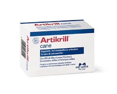 Supporto del metabolismo articolare in caso di osteoartrite. Mangime complementare dietetico destinato a particolari fini nutrizionali per cani adulti e senior con EPA da Olio di pesce, Vitamina E, Glucosamina solfato e Condroitin solfato.