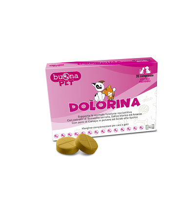 DOLORINA è un mangime complementare per cani e gatti con estratti di Boswellia serrata, Salice bianco e Ananas; con semi di Canapa ed acido alfa-lipoico formulato in compresse appetibili masticabili utile per supportare la normale funzione nocicettiva nell’animale.