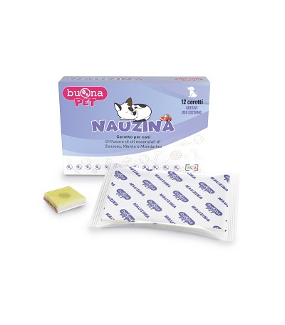 NAUZINA è un cerotto per uso esterno da applicare sul collare, diffusore di oli essenziali di Zenzero, Menta e Mandarino.